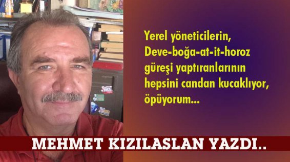 Yerel yöneticilerin, Deve-boğa-at-it-horoz güreşi yaptıranlarının da hepsini candan kucaklıyor, öpüyorum. Bu insanlık dışı, çağ dışı, işlere ayrılan paralarla onlarca küçük fabrika kurulabilir, işsizlik azaltılabilir, tarım ürünleri değerlendirilebilir, diye düşünüyorum.