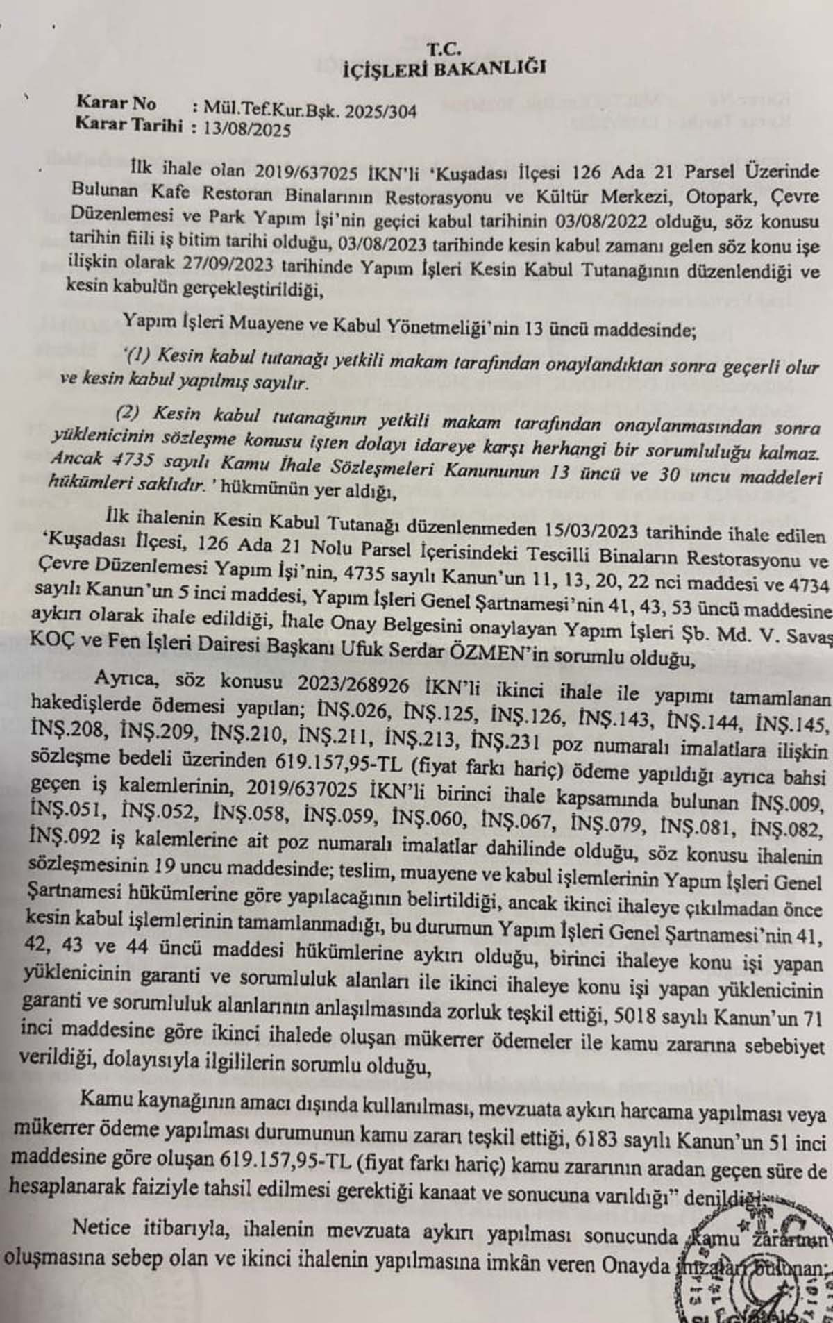 Soruşturma izni verilen iki isim Fen İşleri Daire Başkanı Ufuk Serdar Özmen ile Yardımcılarından Savaş Koç oldu.