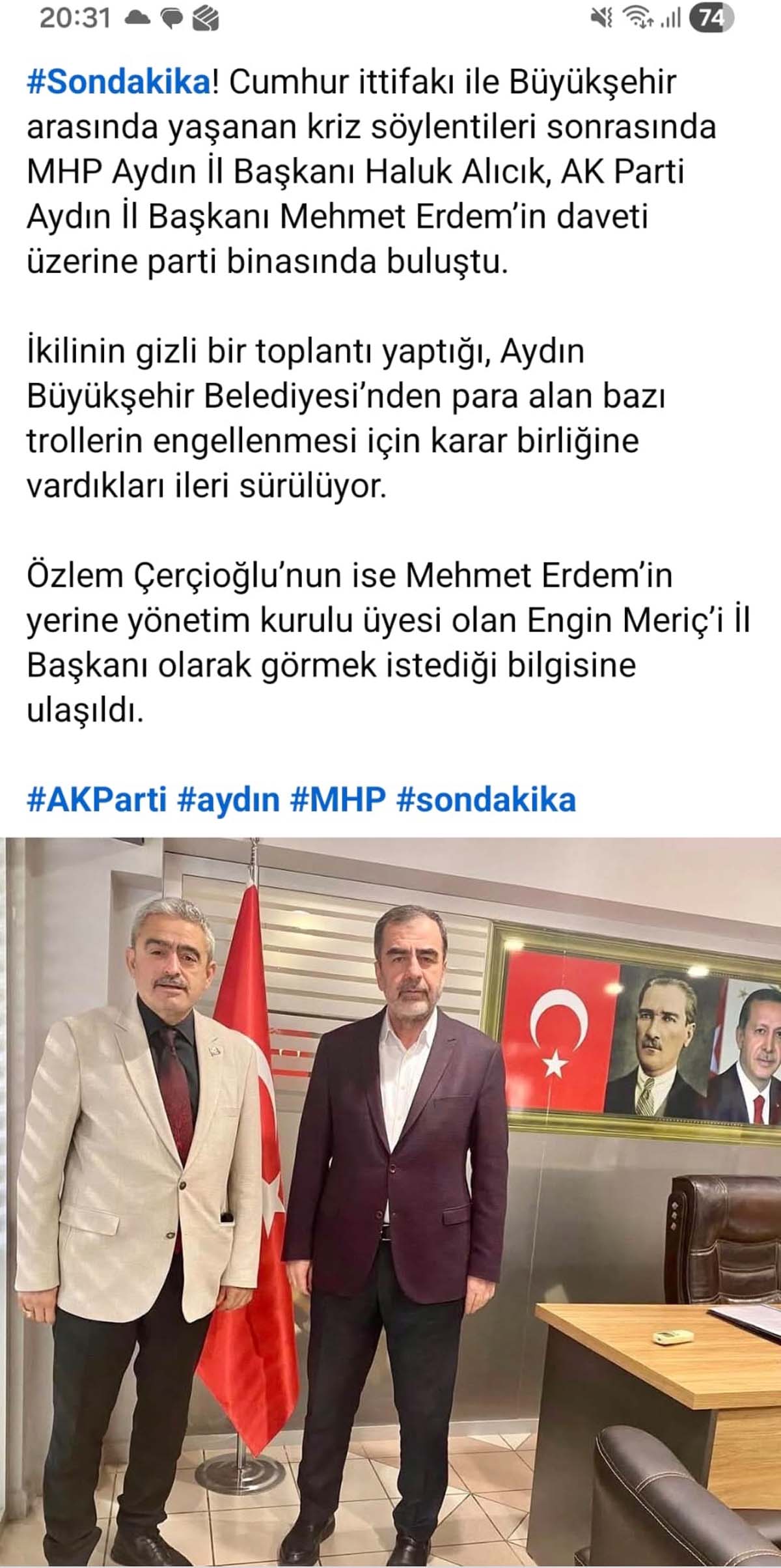 İşte Çerçioğlu'nun, trolü olarak bilinen Levent Sabancı'nın iş ortağı ve yakın arkadaşını AK Parti Aydın İl Başkanı yapma operasyonuna ilişkin iddiaların dile getirildiği o paylaşım;