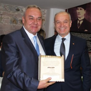 Ayvalık Ticaret Odası Başkanı İbrahim Kantarcı, Ege Zeytin ve Zeytinyağı İhracatçıları Birliği Başkanı Gürkan Renklidağ’a teşekkür plaketi verdi.