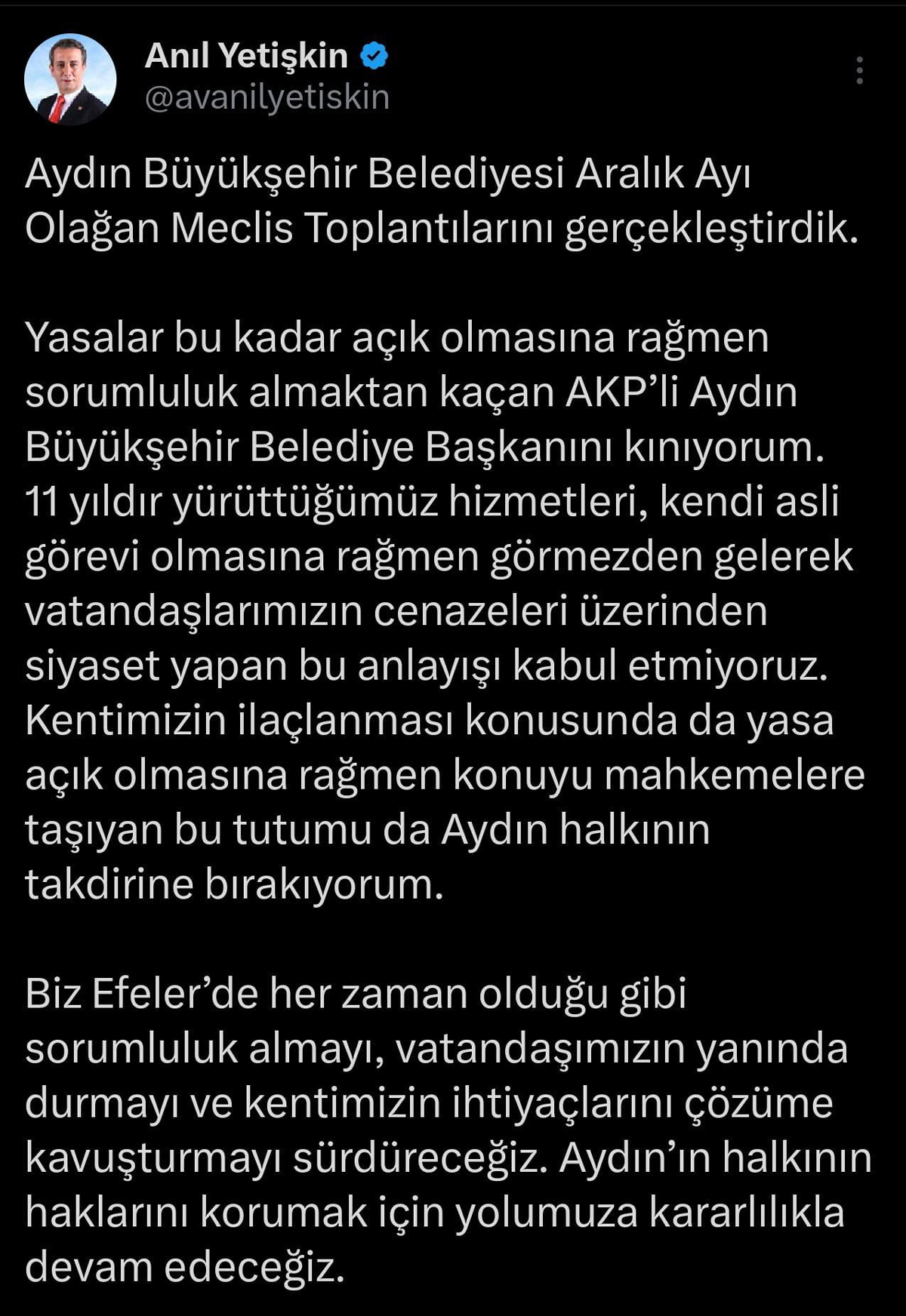 Yasalar bu kadar açık olmasına rağmen sorumluluk almaktan kaçan AKP’li Aydın Büyükşehir Belediye Başkanını kınıyorum.