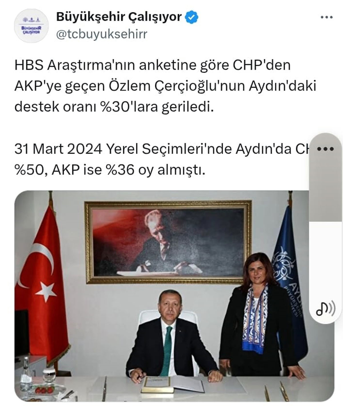 Büyükşehir Çalışıyor isimli X (Twitter) kullanıcısından HBS firması kaynak gösterilerek yapılan paylaşımda, Çerçioğlu'na desteğin yüzde otuzlara indiği belirtiliyor.