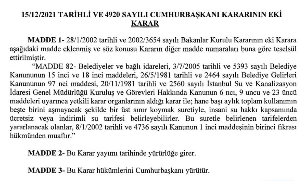 “Su Kanalizasyon Genel Müdürlükleri Bütçe Maliyetinin altında veya ortalama hane halkının tüketim miktarının 1/5'ini aşmamak kaydıyla ve üst sınır belirlemek suretiyle ücretsiz veya indirimli su tarifesi uygulanabileceğini 16/12/2021 tarih ve 4920 sayılı Cumhurbaşkanı Kararnamesi Resmi Gazete yayınlandığı gün itibari ile mümkündür.